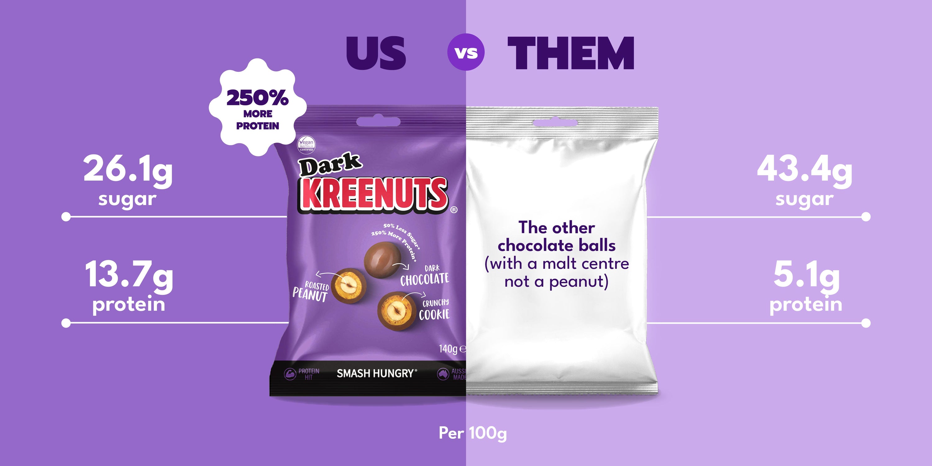 Crunch + protein punch: Whole roasted peanuts inside a crisp cookie shell keep a hearty, satisfying bite. KREENUTS are promoted as high-protein compared with many confectionery treats